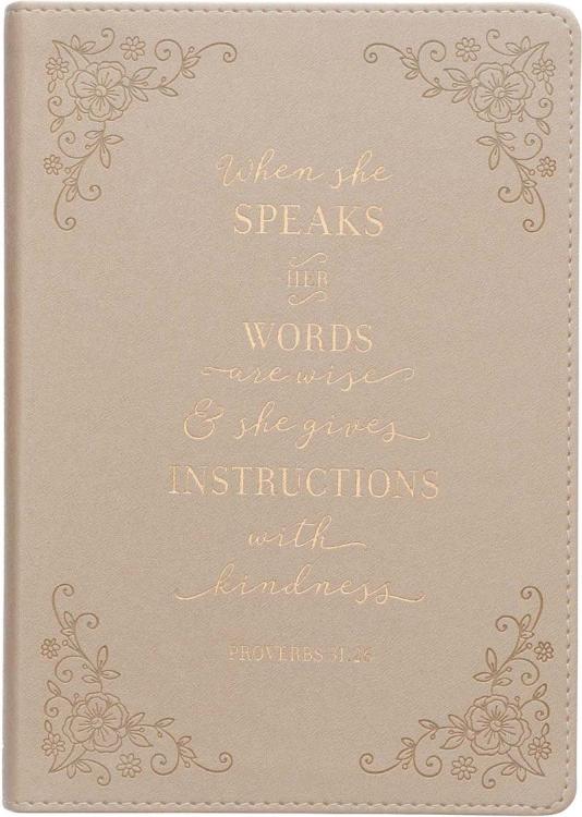 The When She Speaks Taupe Faux Leather Classic Journal makes an excellent gift for a woman that embodies the kindness and wise words of the Proverbs 31 woman. Encourage someone today with a gift that lets her know how much you love and respect her.
